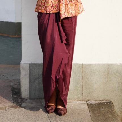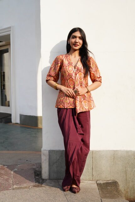 DESCRIPTION Composition: Mango Silk Set Includes: 2-piece set – Kurti & Draped Skirt Fit: Relaxed fit kurti paired with a